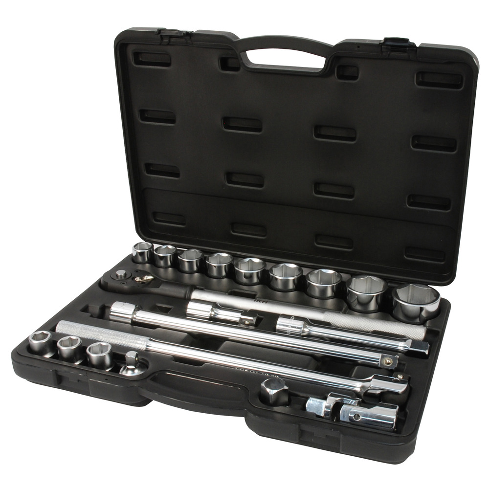 kromivanadiumterästä, kromipinnoite - 12 kpl 6-kulmaiset hylsyt 19 - 21 - 22 - 24 - 27 - 30 - 32 - 36 - 38 - 41 - 46 - 50 mm - 3 kpl jatkovarret 100 - 200 - 400 mm - 2 kpl adapterit 3/4" x 1/2... Lue lisää